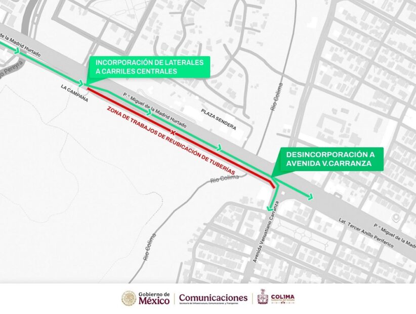 Como parte de los trabajos preliminares para la construcción del paso superior vehicular Arco Norte (avenida Venustiano Carranza), a partir de este jueves 19 de junio se inhabilitará el carril lateral sur del Tercer Anillo Periférico desde la zona del Parque Ecológico ‘La Campana’ hasta el cruce con la avenida V. Carranza, informa el Gobierno del Estado de Colima.