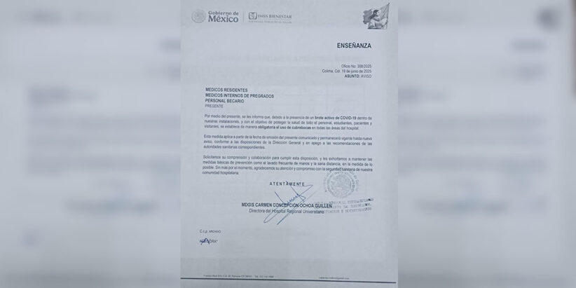 A través de un documento emitido el 19 de junio firmado por la directora del Hospital Regional Universitario, Carmen Concepción Ochoa se avisa a médicos residentes, internos de pregrados y personal becario sobre la presencia de un brote activo de COVID-19 dentro del nosocomio, en donde hay por el momento, diez trabajadores del área de Laboratorio enfermos.