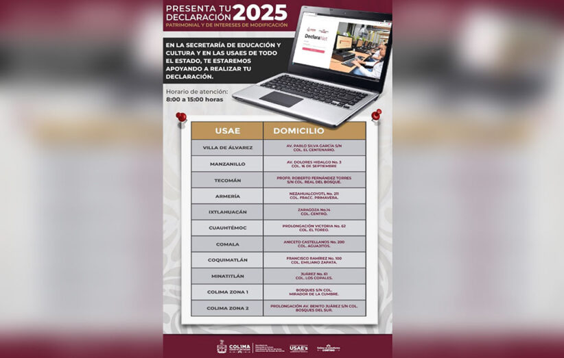 La Secretaría de Educación y Cultura del Gobierno del Estado de Colima informa que, durante lo que resta del presente mes de mayo, personal de esta dependencia estará brindando apoyo a las y los servidores públicos para que realicen en tiempo y forma su Declaración Patrimonial y de Intereses de Modificación 2025.