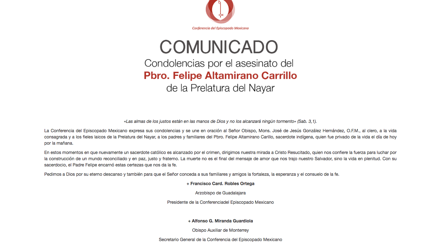La Conferencia del Episcopado Mexicano dio a conocer que el obispo José de Jesús González Hernández, O.F.M., informó de la noticia a través de un comunicado en el que destaca que “nuevamente un sacerdote católico fue alcanzado por el crimen”.