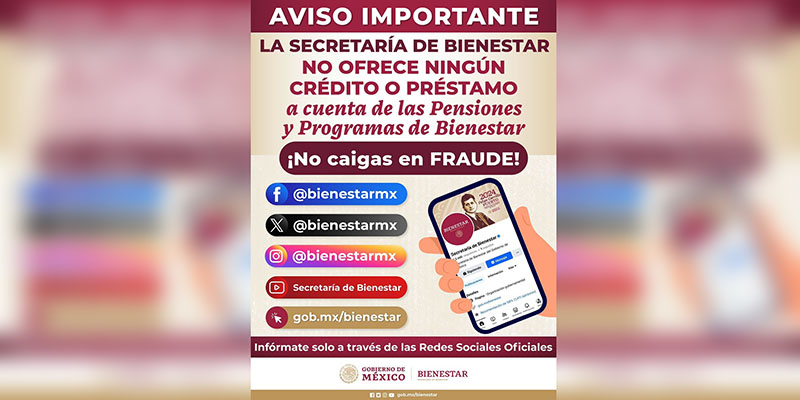 Convocó a la población a no dejarse sorprender por este tipo de engaños, no contestar los mensajes donde se les ofrecen préstamos, ni proporcionar datos personales, número o NIP de la tarjeta del Banco del Bienestar.