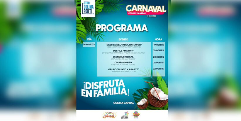 El presidente municipal de Colima, Riult Rivera Gutiérrez, dio a conocer que se modificaron las fechas en que se desarrollará el Carnaval Capital Colima 2024, “Cocos y Palmeras” y todos los eventos realizarán durante el viernes 14 de marzo.