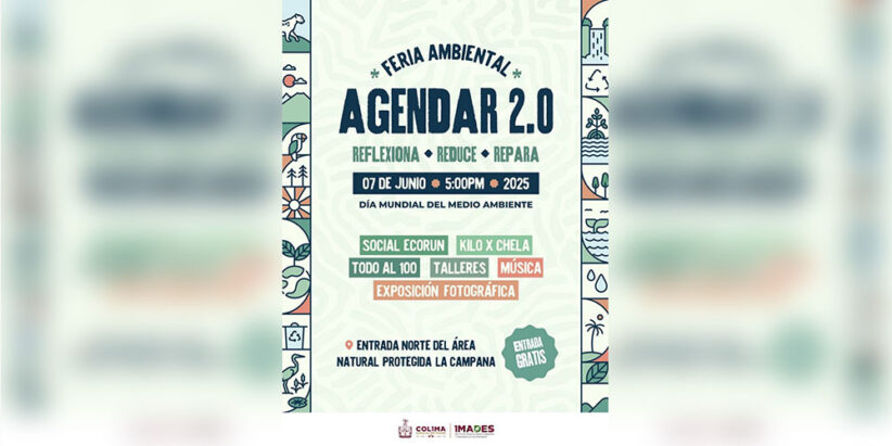 El Gobierno del Estado de Colima, a través del Instituto para el Medio Ambiente y Desarrollo Sustentable (Imades), invita a la población a conmemorar el Día Mundial del Medio Ambiente con el evento ‘AgendaR 2.0’, que se llevará a cabo el sábado 7 de junio en la zona norte del Área Natural Protegida en el Parque Ecológico La Campana, a partir de las 5:00 de la tarde.
