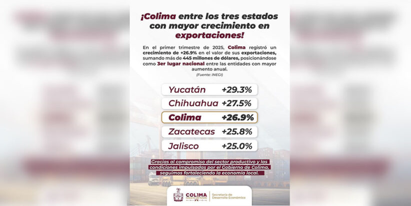 La Secretaría de Desarrollo Económico (Sedeco) del Gobierno del Estado de Colima informa que, de acuerdo con el más reciente reporte del Instituto Nacional de Estadística y Geografía (INEGI), Colima se posicionó como la tercera entidad federativa con mayor crecimiento anual en el valor de sus exportaciones durante el primer trimestre de 2025.