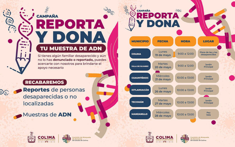 La Comisión de Búsqueda de Personas del Estado de Colima exhorta a todas las personas que tengan un familiar desaparecido o no localizado y aún no hayan presentado reporte o denuncia, a sumarse a la Campaña Reporta y dona tu Muestra Genética, que se realizará del 19 al 27 de mayo, en coordinación interinstitucional con los tres órdenes de gobierno y la participación de colectivos, en la que se busca obtener muestras de ADN de familiares directos de personas desaparecidas para ayudar a identificarlas.