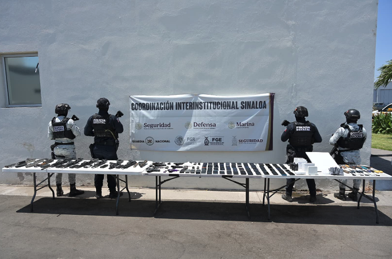 -En Culiacán, elementos del Ejército Mexicano, GN, Semar, FGR, Fiscalía y Policía Estatal realizaron una inspección en dos módulos del Centro Penitenciario de Aguaruto, aseguraron nueve armas largas, siete armas cortas, una subametralladora, cargadores, 245 dosis de cocaína, 53 celulares, un equipo de internet, siete módems, tres radios de comunicación y 29 armas punzocortantes.