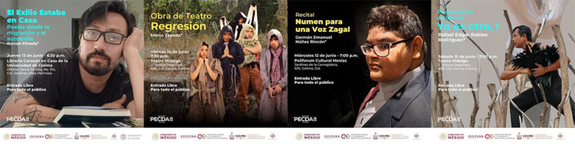 Esta semana continúan las Muestras PECDA (Programa Estímulo a la Creación y Desarrollo Artístico) que la Subsecretaría de Cultura del Gobierno del Estado de Colima lleva a diferentes foros y plazas públicas en los diez municipios de la entidad, en esta ocasión con nuevos recitales, obras de teatro y funciones de danza para todo el público de la capital colimense.