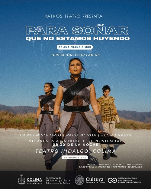 La Subsecretaría de Cultura del Gobierno del Estado de Colima, en coordinación con la Secretaría de Cultura del Gobierno de México, invita a todo público para disfrutar de la breve temporada de la obra ‘Para soñar que no estamos huyendo’, puesta escena de la compañía colimense Pathos, que ofrecerá dos funciones gratuitas el viernes 15 y sábado 16 de noviembre, a las 20:30 horas en el Teatro Hidalgo, en el centro histórico de la capital colimense.