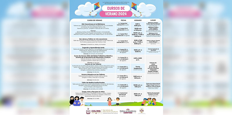 La Subsecretaría de Cultura del Gobierno del Estado de Colima invita a niñas, niños, adolescentes, jóvenes y personas adultas a inscribirse a alguno de los cursos de verano que se realizarán durante el periodo vacacional de julio y agosto, para promover una cultura de paz a través del acercamiento a la formación artística y generar espacios de sana recreación en distintos puntos de la entidad.