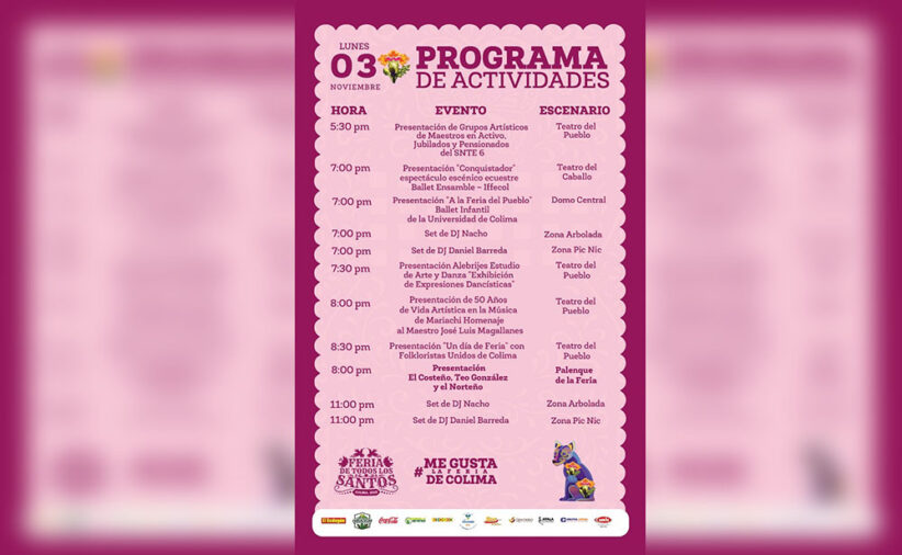 La Feria de Todos los Santos Colima 2025 ofrece un ambiente de alegría, cultura y entretenimiento para todas las familias y este lunes 3 de noviembre, en el cuarto de los 18 días que dura el máximo festejo de la entidad, las y los visitantes podrán disfrutar una variada programación que combina espectáculos artísticos, presentaciones culturales, música y comedia.
