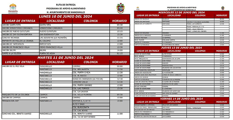 El jueves 13, a partir de las 10 de la maña, la entrega será para El Petatero, Chandiablo, Aserradero de la Lima, Don Tomás, Parajes, Huizcolotila, Veladero de los Otates, Camotlán, El Huizcolote, Lomas de Ávila Camacho, Cedros Ciruelito de La Marina, El Llano de la Marina, Puertecito de Lajas, Canoas, El Camichín, Veladero de Camotlán, San José de Lúmber y en La Rosa.