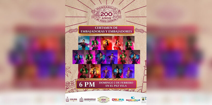 El Gobierno de Manzanillo, a través de la dirección de Turismo, invita a las y los manzanillenses al certamen de embajadoras y embajadores del Carnaval #200AñosDelPuerto, este domingo 2 de febrero a partir de las 6 de la tarde, en la explanada del Pez Vela.