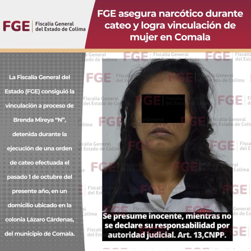 La Fiscalía General del Estado (FGE) consiguió la vinculación a proceso de Brenda Mireya “N”, detenida durante la ejecución de una orden de cateo efectuada el pasado 1 de octubre del presente año, en un domicilio ubicado en la colonia Lázaro Cárdenas, del municipio de Comala.