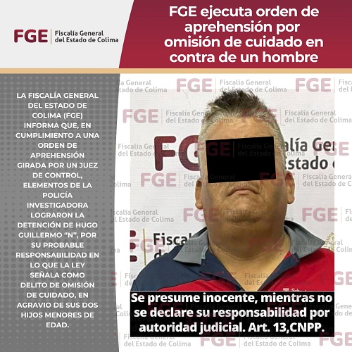 La Fiscalía General del Estado de Colima (FGE) informa que, en cumplimiento a una orden de aprehensión girada por un Juez de Control, elementos de la Policía Investigadora lograron la detención de Hugo Guillermo “N”, por su probable responsabilidad en lo que la ley señala como delito de omisión de cuidado, en agravio de sus dos hijos menores.