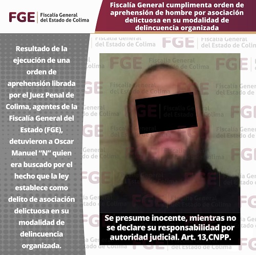 Resultado de la ejecución de una orden de aprehensión librada por el Juez Penal de Colima, agentes de la Fiscalía General del Estado (FGE), detuvieron a Oscar Manuel “N” quien era buscado por el hecho que la ley establece como delito de asociación delictuosa en su modalidad de delincuencia organizada.