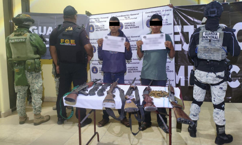 -En José Joaquín de Herrera, elementos de GN, Ejército Mexicano y Fiscalía Estatal, al atender un reporte de emergencias, detuvieron a dos personas, les aseguraron cinco armas largas, cinco cargadores y 180 cartuchos.