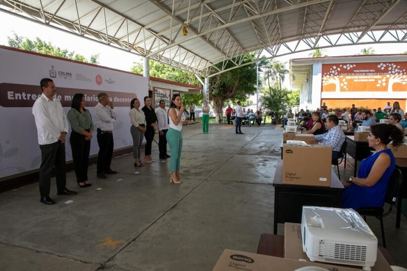 La gobernadora Indira Vizcaíno Silva, entregó 242 juegos de escritorios y sillas para docentes de secundaria, así como 81 proyectores a 18 planteles urbanos de los municipios de Colima y Villa de Álvarez, con inversión superior a 2.3 millones de pesos, en un evento que se realizó este lunes en la escuela secundaria Manuel Álvarez, en el municipio villalvarense.