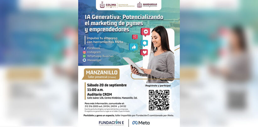 El Gobierno del Estado de Colima, a través de la Secretaría de Desarrollo Económico (Sedeco), en coordinación con el Ayuntamiento de Manzanillo, la Fundación E y la empresa Meta, invita a personas emprendedoras, así como pequeñas y medianas empresas, a participar en el taller presencial ‘IA Generativa: Potencializando el marketing de pymes y emprendedores’, que se llevará a cabo el sábado 20 de septiembre a las 11:00 de la mañana en el auditorio de la CROM, en calle Juárez 126, centro histórico de Manzanillo.