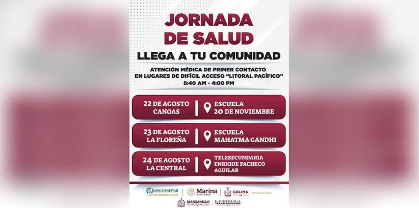 Estas jornadas se realizarán del 22 al 24 de agosto, en un horario de 8:30 de la mañana a 4 de la tarde, con el propósito de acercar servicios médicos esenciales a las familias de Manzanillo y garantizar su derecho a la salud.