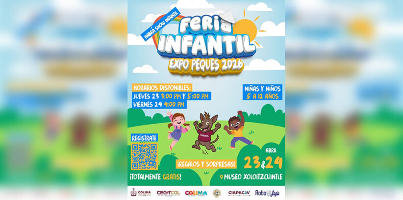 En el marco del próximo ‘Día del Niño y la Niña’, el Consejo Estatal de Ciencia y Tecnología (Cecytcol) del Gobierno del Estado de Colima que encabeza la gobernadora Indira Vizcaíno Silva, en coordinación con diversas instituciones, invita a participar en la Feria Infantil Expo Peques 2026 este jueves 23 y viernes 24 de abril en el Museo Xoloitzcuintle en el Parque Piedra Lisa, evento gratuito y abierto al público con registro previo.