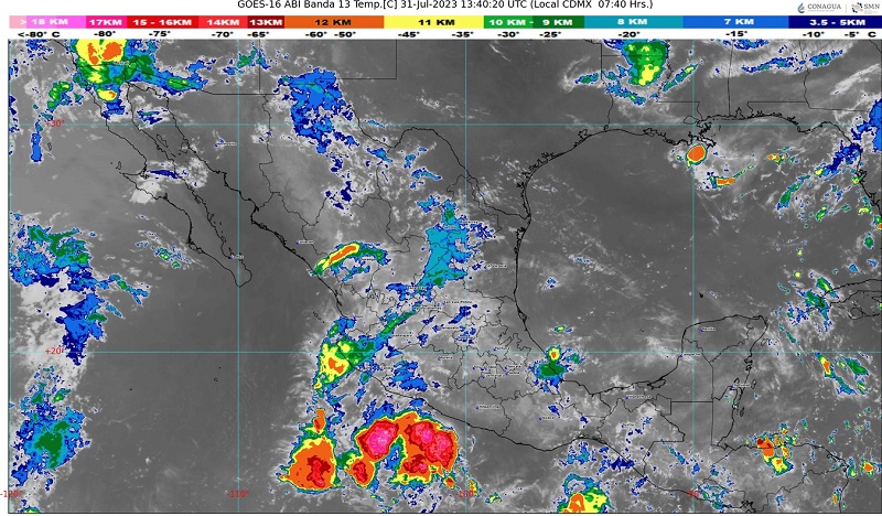 Para el Pacifico Centro, el SMN estima cielo medio nublado a nublado y ambiente fresco a templado por la mañana. Bancos de niebla y lluvias matutinas en zonas serranas de la región. Por la tarde, ambiente cálido a caluroso, con cielo nublado y lluvias puntuales muy fuertes en Colima, Jalisco, Michoacán y Nayarit, las cuales podrían aumentar los niveles de ríos y arroyos, y generar deslaves e inundaciones.