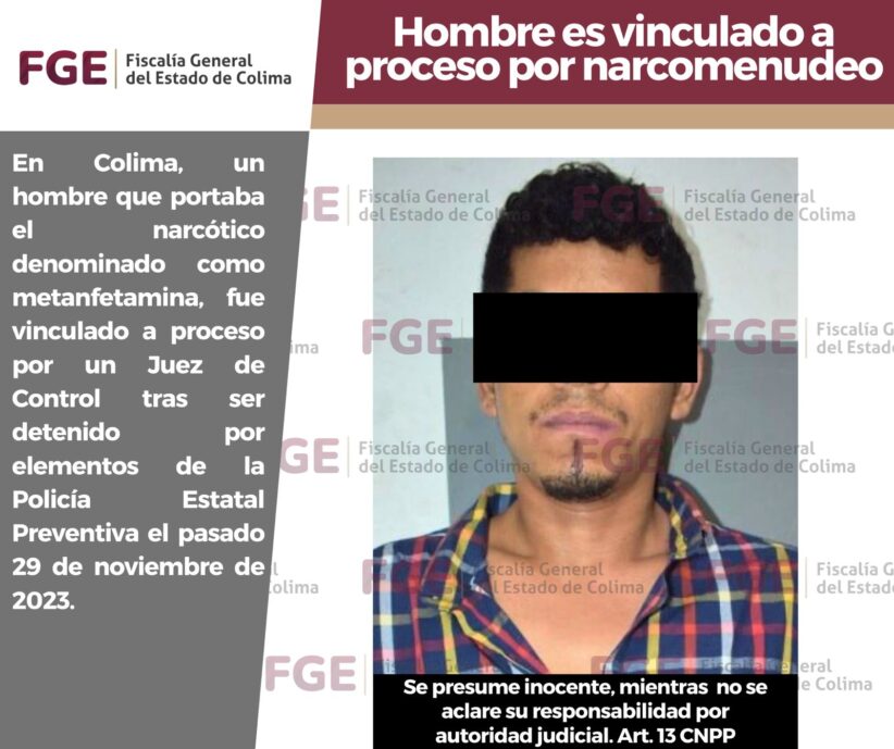 En Colima, un hombre que portaba el narcótico denominado como metanfetamina, fue vinculado a proceso por un Juez de Control tras ser detenido por elementos de la Policía Estatal Preventiva el pasado 29 de noviembre de 2023.