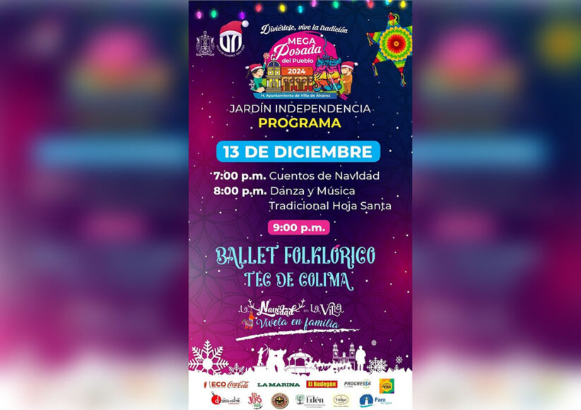 Con la presentación estelar del Ballet Folklórico del TEC de Colima, este viernes 13 iniciará la Mega Posada del Pueblo en el Jardín Independencia (Jardín Principa), organizada por el Ayuntamiento de Villa de Álvarez.