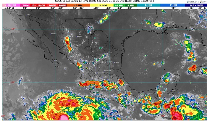 En el pronóstico de lluvias para este miércoles 6 de septiembre, Conagua anticipa probables lluvias muy fuertes con puntuales intensas (de 75 a 150 milímetros) en Puebla, Guerrero, Oaxaca, Chiapas y Veracruz, así como lluvias fuertes con puntuales muy fuertes (de 50 a 75 mm) en Colima, Jalisco, Michoacán, Estado de México, Sinaloa, Nayarit, Morelos y Tabasco.