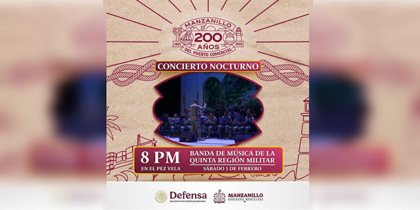 En el marco de los festejos por los #200AñosDelPuerto, el gobierno de Manzanillo, a través de la dirección de Cultura, invita a las familias a unirse al concierto nocturno de la banda de música de la Quinta Región Militar. La cita es este sábado 1 de febrero a las 8 de la noche en la Explanada del Pez Vela.