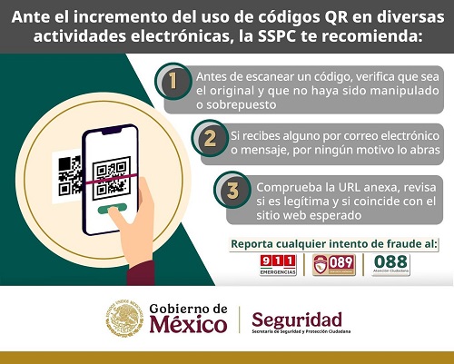 Ante el incremento del uso de códigos QR en diversas actividades electrónicas, la Secretaría de Seguridad y Protección Ciudadana (SSPC), a través de la Dirección General de Gestión de Servicios, Ciberseguridad y Desarrollo Tecnológico, alerta a la población sobre el robo de información personal y financiera por medio de códigos QR falsos y emite recomendaciones para ser víctimas de estos delitos.