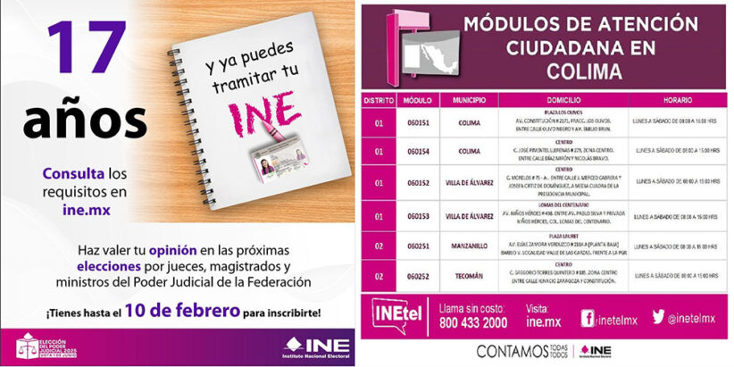 La Junta Local Ejecutiva del Instituto Nacional Electoral (INE) en Colima hace una atenta invitación a las y los jóvenes de 18 años y a quienes los cumplirán hasta el 1 de junio, a que se inscriban en el Padrón Electoral para que puedan obtener su primera Credencial para Votar.