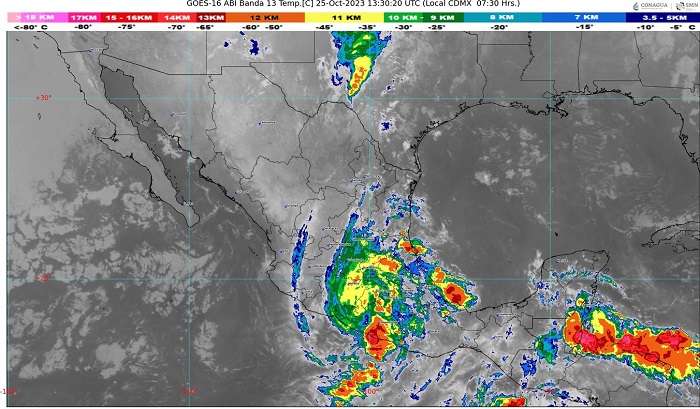 Hoy miércoles 25 de octubre, el huracán ‘Otis’ se ha debilitado a categoría 2 en la escala Saffir-Simpson; sin embargo ocasionará lluvias puntuales muy fuertes a intensas en el sur del país, con puntuales extraordinarias (acumulados superiores a 250 milímetros en 24 horas), rachas intensas de viento y oleaje elevado en Guerrero.