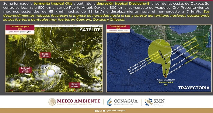 La noche de este domingo 22 de octubre se formó la tormenta tropical ‘Otis’, su centro se localiza a 600 kilómetros al sur de Puerto Ángel, Oaxaca y a 800 kilómetros de Acapulco, Guerrero.
