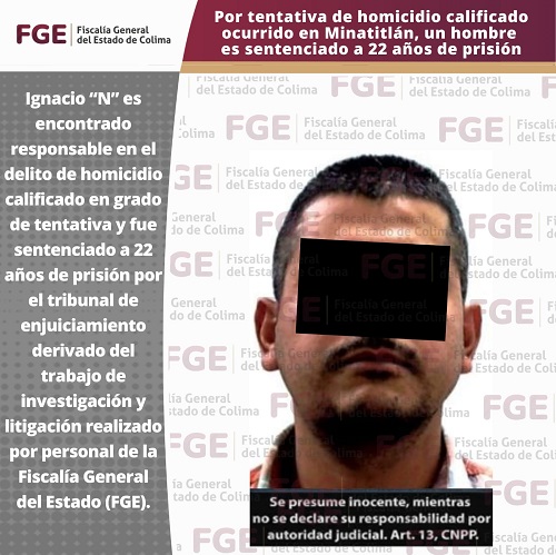 Ignacio “N” es encontrado responsable en el delito de homicidio calificado en grado de tentativa y fue sentenciado a 22 años de prisión por el tribunal de enjuiciamiento derivado del trabajo de investigación y litigación realizado por personal de la Fiscalía General del Estado (FGE).