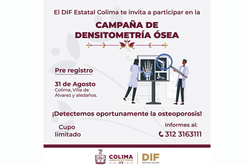 La directora general del DIF Estatal Colima, Rosi Bayardo Cabrera, informó que esta institución realizará estudios gratuitos de densitometría ósea este jueves 31 de agosto a personas de cincuenta años en adelante, que vivan en la zona conurbada de Colima-Villa de Álvarez, así como en los municipios aledaños.