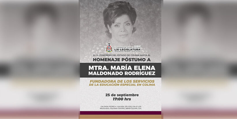 En la sede del Poder Legislativo del Estado de Colima, este jueves 25 de septiembre de 2025 a las 5:00 de la tarde, se rendirá un homenaje póstumo a la Maestra María Elena Maldonado Rodríguez, fundadora de la Educación Especial en el Estado de Colima.