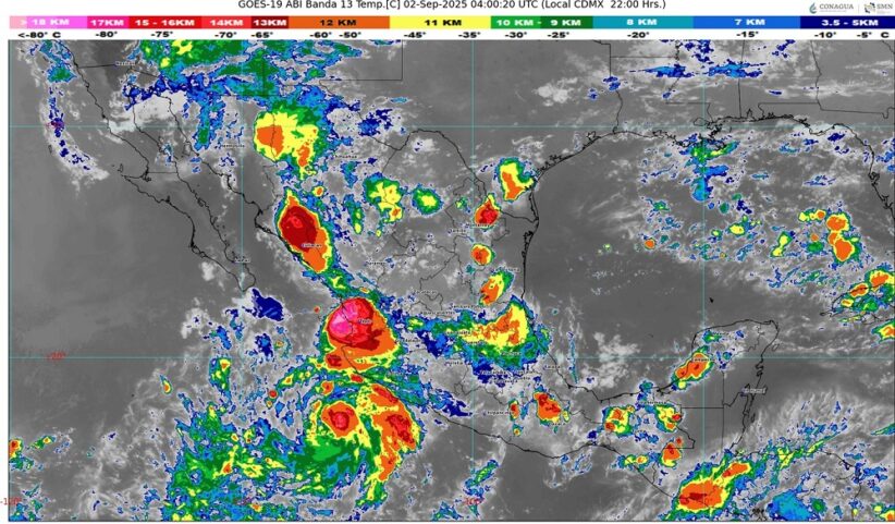 la Depresión Tropical Doce-E se ubica aproximadamente a 230 kilómetros al Sur-Suroeste de Manzanillo, Colima, presenta vientos sostenidos de 55 kilómetros por hora y se desplaza hacia el Oeste-Noroeste con una velocidad de 23 kilómetros por hora.