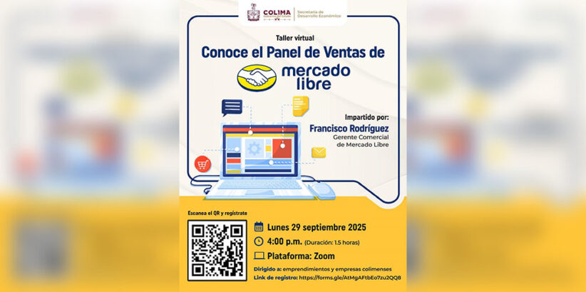 La Secretaría de Desarrollo Económico (Sedeco) del Gobierno del Estado de Colima invita a las y los emprendedores, comerciantes y empresarios de la entidad a participar en el taller virtual gratuito ‘Conoce el Panel de Ventas de Mercado Libre’, el próximo lunes 29 de septiembre a las 4:00 de la tarde a través de la plataforma Zoom, donde podrán aprender a gestionar, optimizar y vender de manera más eficiente en el marketplace número uno de Latinoamérica.