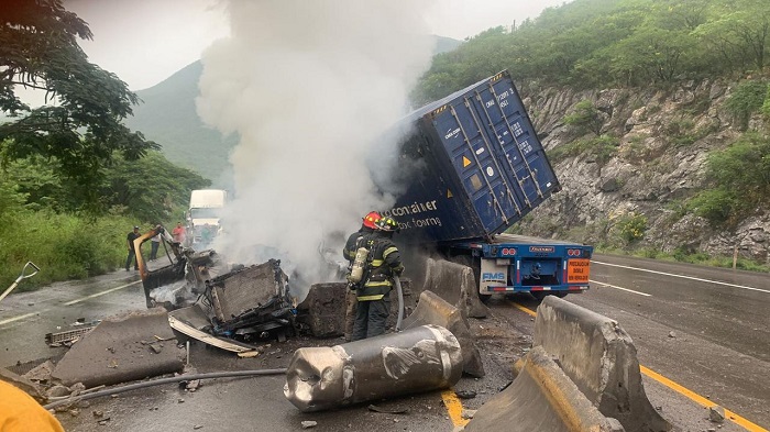 Oficiales de la Unidad Estatal de Protección Civil, acudieron hasta el sitio para acordonar la zona y sofocar un siniestro originado en la cabina del tráiler tras el accidente junto a voluntarios de Bomberos Colima.