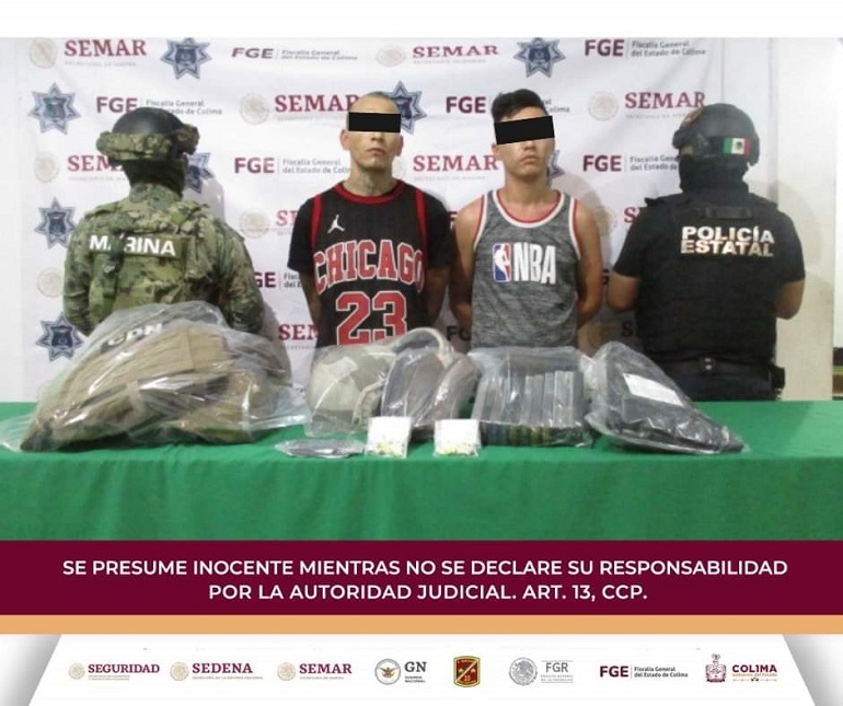Al realizar el patrullaje preventivo en la capital colimense, elementos de la Policía Estatal Preventiva (PEP) detectaron a dos personas en actitud evasiva; después de una revisión, se les encontraron más de 50 dosis de droga sintética, así como diversos cargadores y chalecos tácticos, por lo que se procedió a su legal detención.