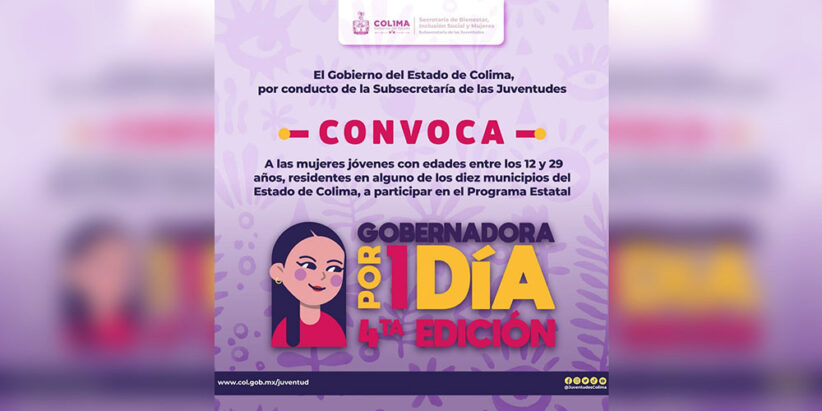 El Gobierno del Estado de Colima, a través de la Subsecretaría de las Juventudes (Subsejuv), lanza la cuarta edición de la convocatoria ‘Gobernadora por un día’ como parte de las actividades para conmemorar el reciente Día Internacional de la Mujer, donde podrán participar niñas y mujeres de 12 a 29 años de edad.