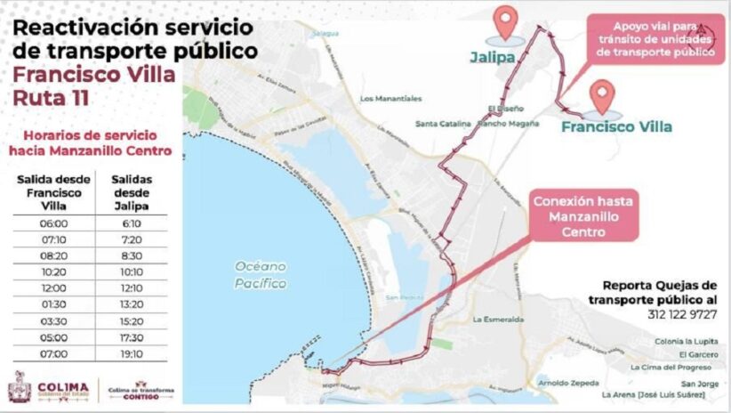 La Subsecretaría de Movilidad (Subsemov) del Gobierno del Estado de Colima implementa diversas acciones para restablecer la regularidad y operatividad del servicio de transporte público que atiende a las localidades de Jalipa y Francisco Villa, en el municipio de Manzanillo.