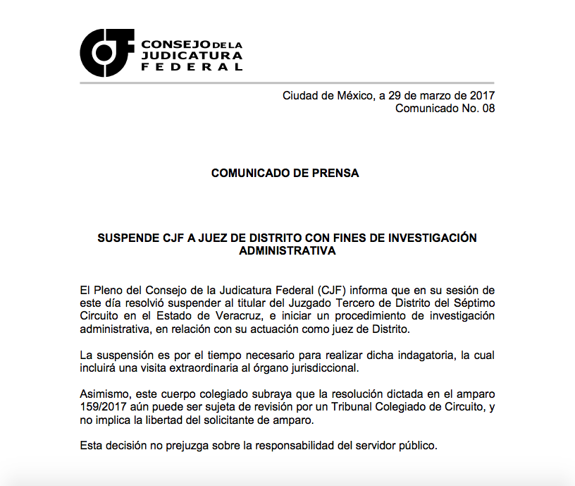 El Consejo de la Judicatura Federal suspendió a Anuar González Hemadi, juez responsable de otorgarle el amparo a Diego Cruz, debido a que inició una investigación en su contra.