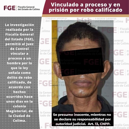 La investigación realizada por la Fiscalía General del Estado (FGE), permitió al Juez de Control vincular a proceso a un hombre por lo que la ley señala como delito de robo calificado, de acuerdo con hechos ocurridos hace unos días en la colonia Magisterial, de la Ciudad de Colima.