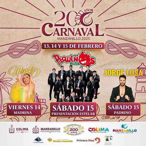 El gobierno municipal, a través de la dirección de Turismo, informó que del jueves 13 al sábado 15 de febrero se llevará a cabo el carnaval “200 Años del Puerto de Manzanillo”, tres días de fiesta, alegría y sorpresas, engalanado con Wendy Guevara como madrina, Jorge Losa como padrino y la presentación gratuita de Pequeños Musical.